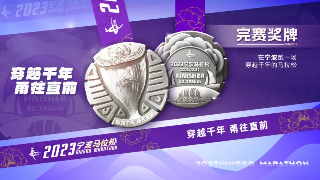 2023宁波马拉松奖牌正面以河姆渡文化为主,结合奥运冠军之城奖杯设计而成。双鸟朝阳纹,代表着宁波深厚的人文底蕴和作为制造业发源地之一的历史积淀;奥运冠军之城的奖杯则是宁波崭新的城市名片,是宁波勇立潮头、争创一流精神的完美体现。奖牌背面则以宁波市花——茶花环绕点缀,结合羽人竞渡到碧波扬帆的概念,塑造了从7000年前远古时代的沧海桑田到如今现代化滨海大都市的火热建设,呼应“穿越千年,甬往直前”的主题口号。