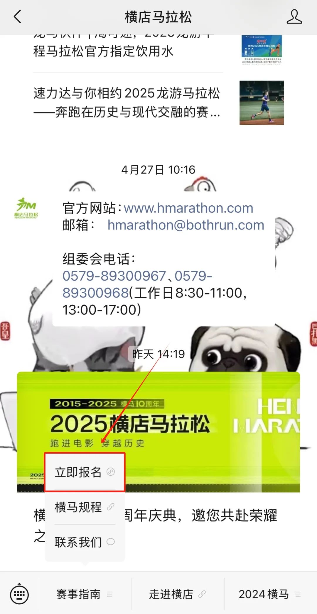 在微信公众号:横店马拉松,对话框点击“赛事指南”,再点击“立即报名”,完成报名步骤。